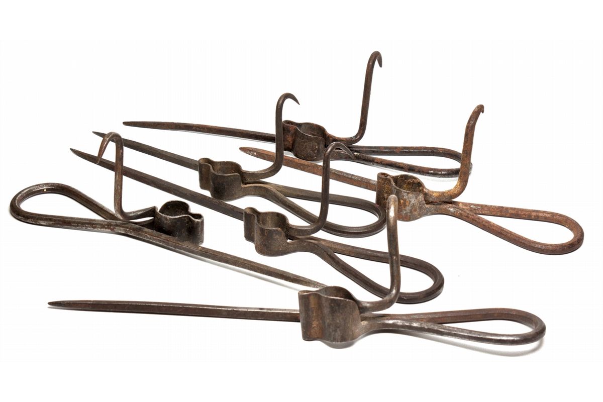 Lot of 6. The Varney Company was headquartered in Denver, Colorado and was very active in the making of miners candlesticks. This is a collection of six examples of Varney's patent, a very simple and practical design, that is formed from one piece of metal with no rivets to attachments. Two are stamped, BONANZA, with one measuring 9.5", the other 10.5". Two are stamped RUSSELL and are 11" and 12" respectively. The one marked IMPERIAL is 10" and the ROYAL stamped stick is 10.5" long. All are in very nice condition, the ROYAL one having a bit more rust. - Jacobitz Collection -59802