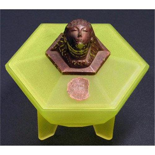 Known as Sphinx or King Tut, this very rare Art Deco Vaseline satin glass powder jar features a gold painted figural finial of a Sphinx head, while the jar is a cone shaped hexagon standing on three feet. This figural powder jar is shown and described on pages 44-45 in Whitmyer: Bedroom & Bathroom Glassware of the Depression Years. Beautifully executed with fine definition to the Sphinx features and an incredible Art Deco geometric shape. The jar with lid measures 5 x 5 1/4 inches. With the exception of a tiny sliver off one underneath corner of the lid and some wear to the gold paint both the lid and jar of this very rare powder jar in this very rare yellow vaseline color are in excellent condition. The jar fluoresces beautifully under black light