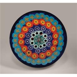 Vasart concentric millefiori paperweight, with a central cluster of bundled rod canes, encircled by four rings of assorted canes in white, lavender, orange, yellow, and light blue, on cobalt blue ground. Diameter 3". $650-900