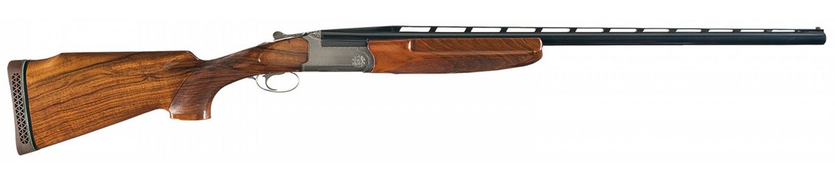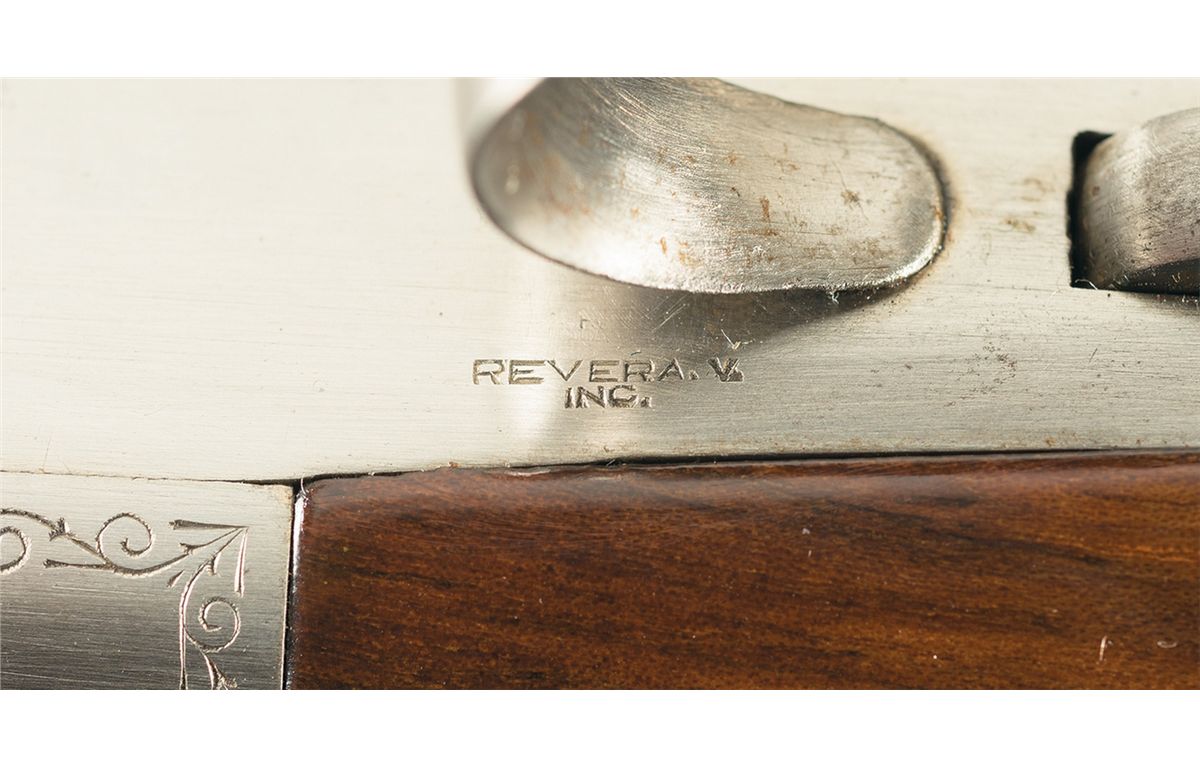 Manufactured in 1978. There is beautifully executed floral scroll and rose bouquet engraving on and around the hinge pin. The top of the receiver and break lever are engraved with floral scroll designs. There is a decorative border engraved around the outside edge of the receiver. The trigger plate is signed "Revera V./Inc.". The barrel has a single red fiber optic sight, is choked extra full and has a 2 3/4 inch chamber with extractor. Mounted on a nicely figured, multi-point checkered walnut forearm and pistol grip stock with raised comb and recoil pad. Length of pull is 14 1/2 inches.