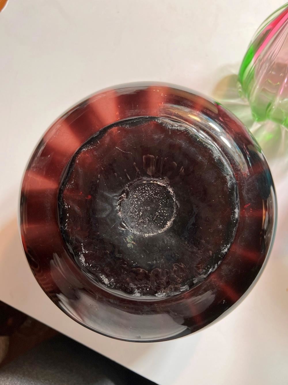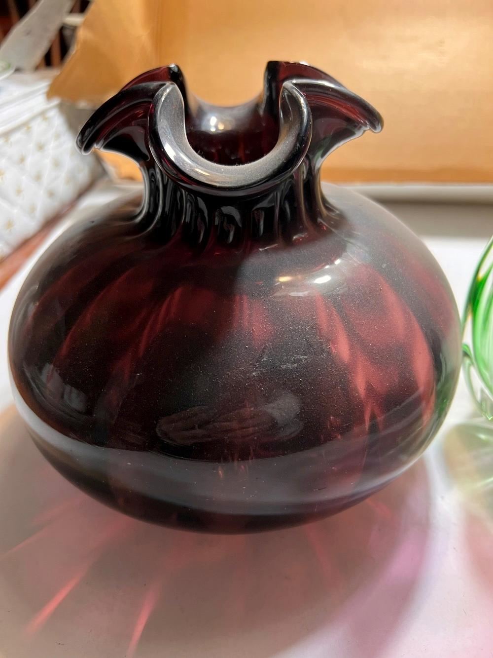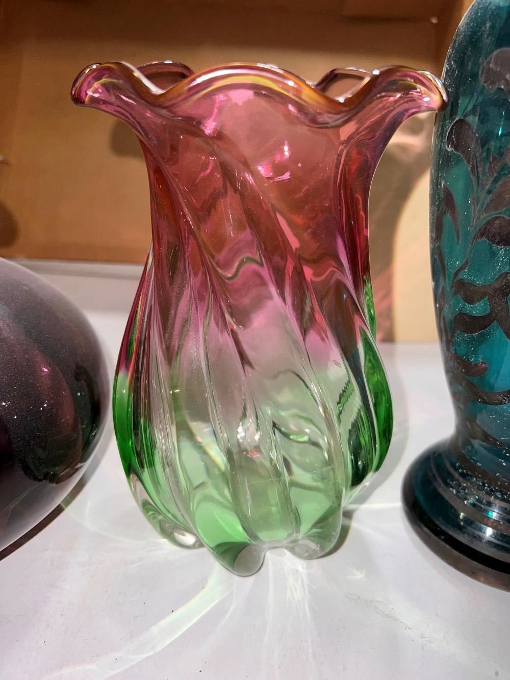3 Vases. Turquoise vase with silver overlay. Cranberry and lime green Art Glass vase, heavy swirl and ground pontal. And an Amethyst vase with flower center, full pontal. Tallest vase measures approx. 10.5 inches tall.