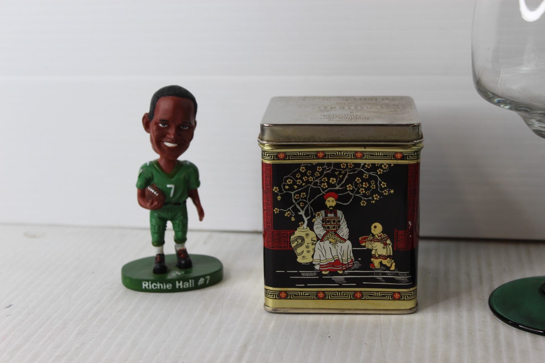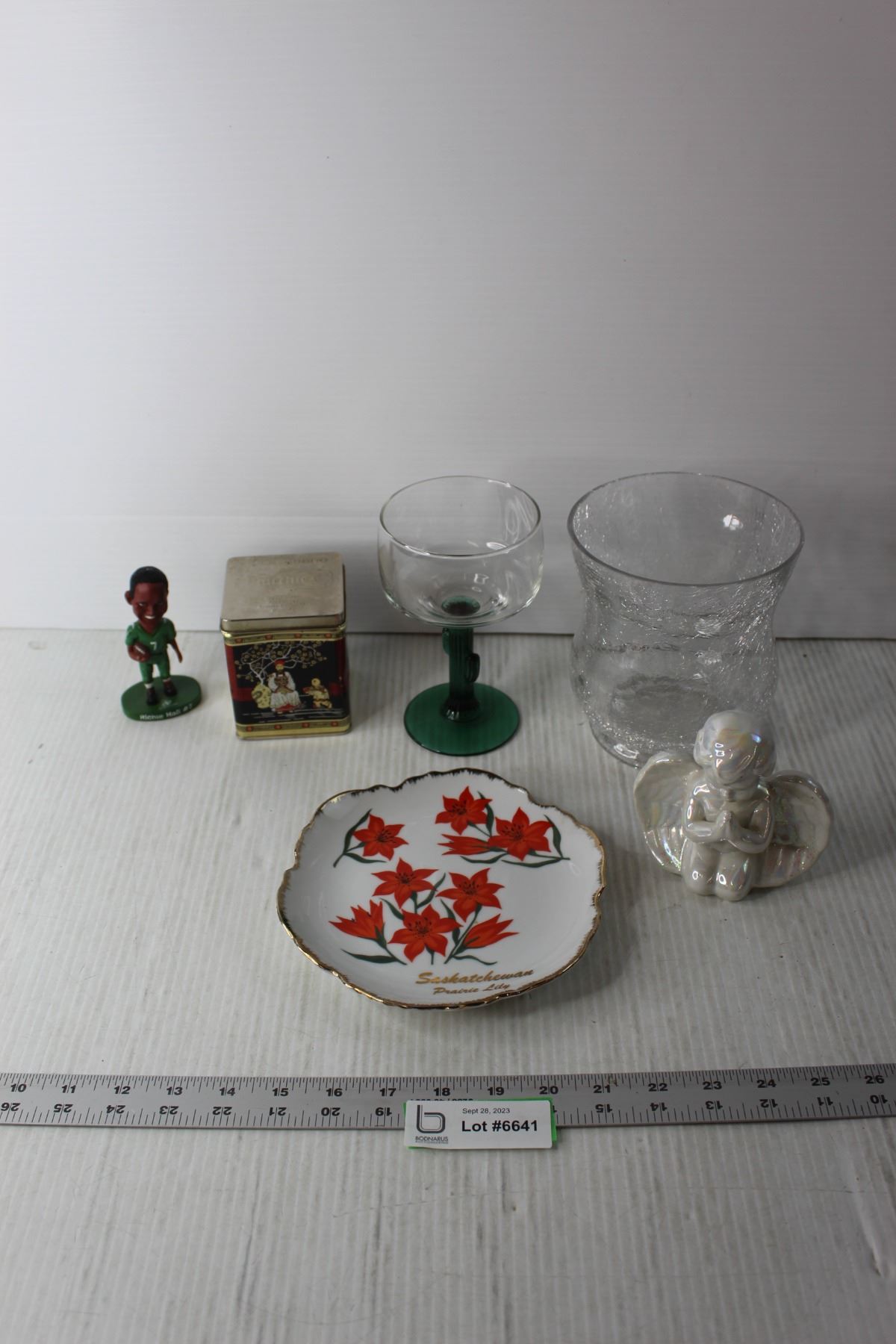 Vase, Glass, Tin, Saskatchewan Lily Plate, Angel and Richie Hall Bobble Head