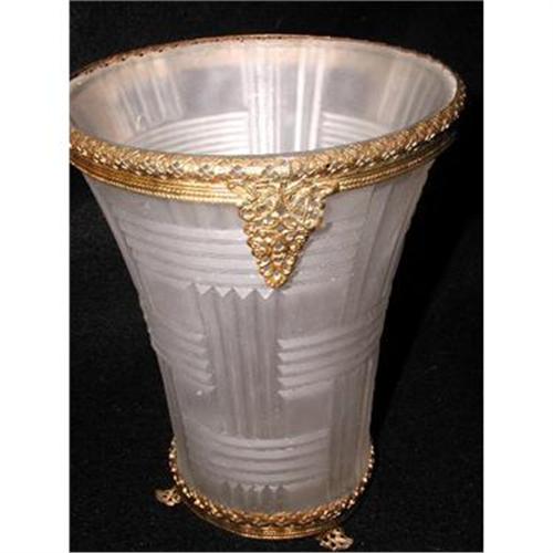 Satin C.1900 glass footed vase has a raised plaid design in the obscure glass. Stands on gold filigree base with open work design and three delicate feet. Same band surrounds the top with three ornate elongated pieces of filigree. Excellent companion to MM2451. Measures 7.25H X 5.75W X 5.75L. Excellent condition,no nicks,chips or cracks.