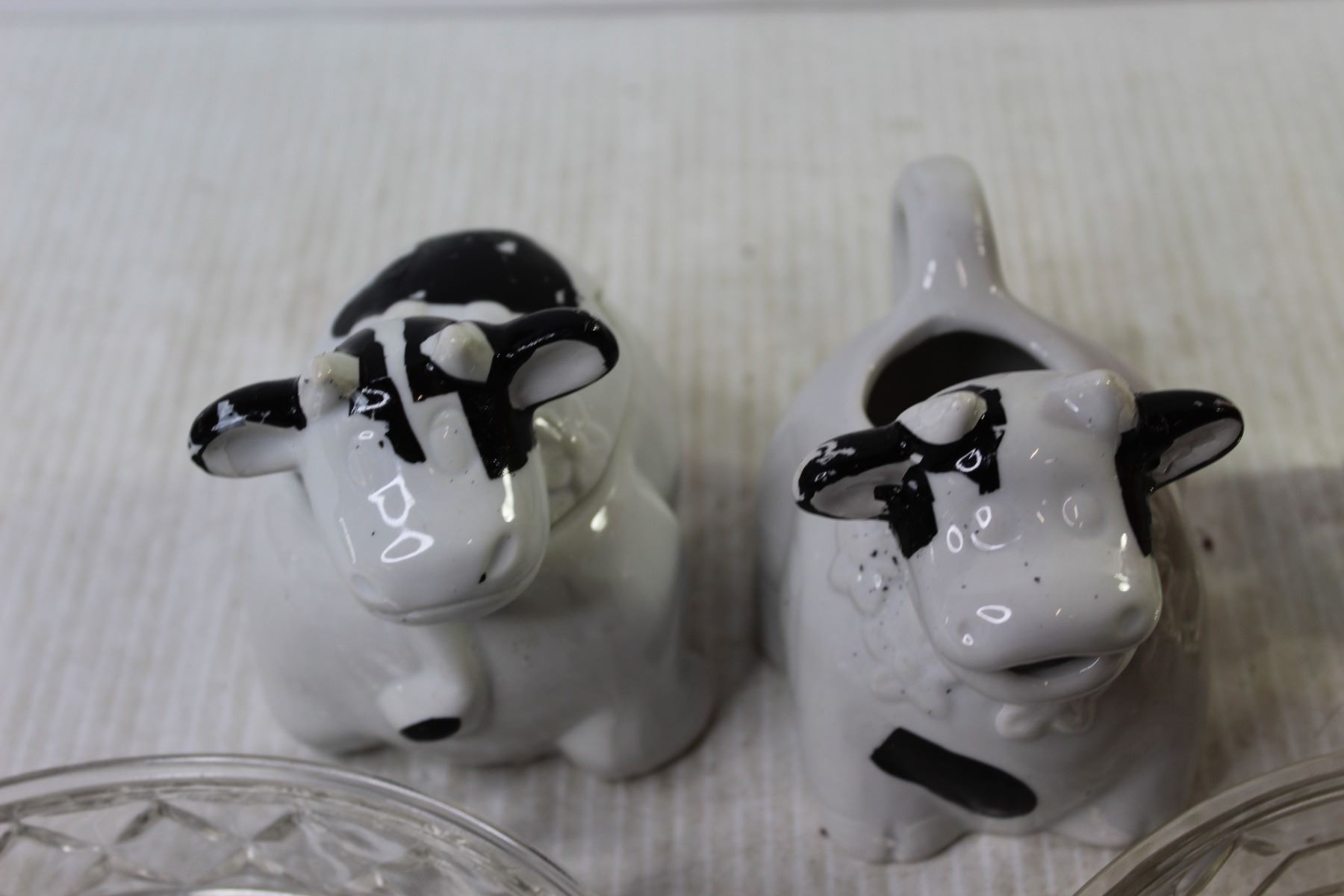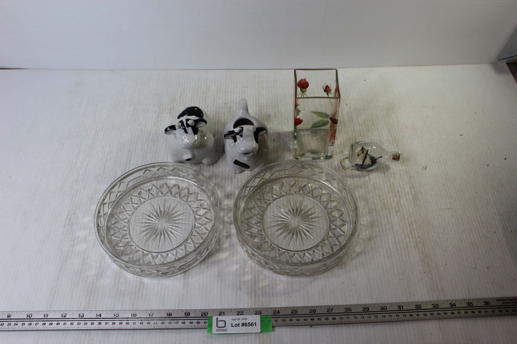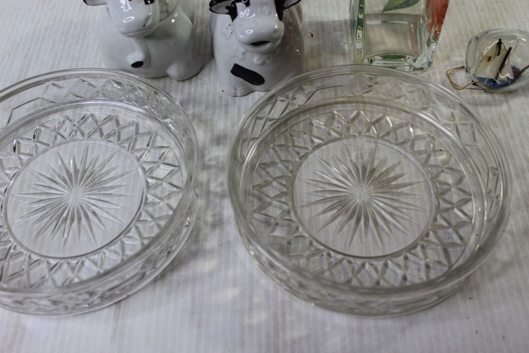 Vase + Ship in a Bottle + (2) Glass Dishes + (2) Cow Containers