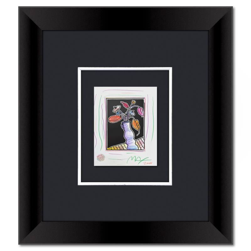 "Vase of Flowers I" is a one-of-a-kind mixed media on paper, hand signed by Peter Max. The piece comes custom framed with a backside cutout to display Peter Max Studio registration number 340594 certifying authenticity. Measures approximately 23" x 21" (frame), 9" x 7" (image). This item requires special handling and may have a longer than usual turnaround.