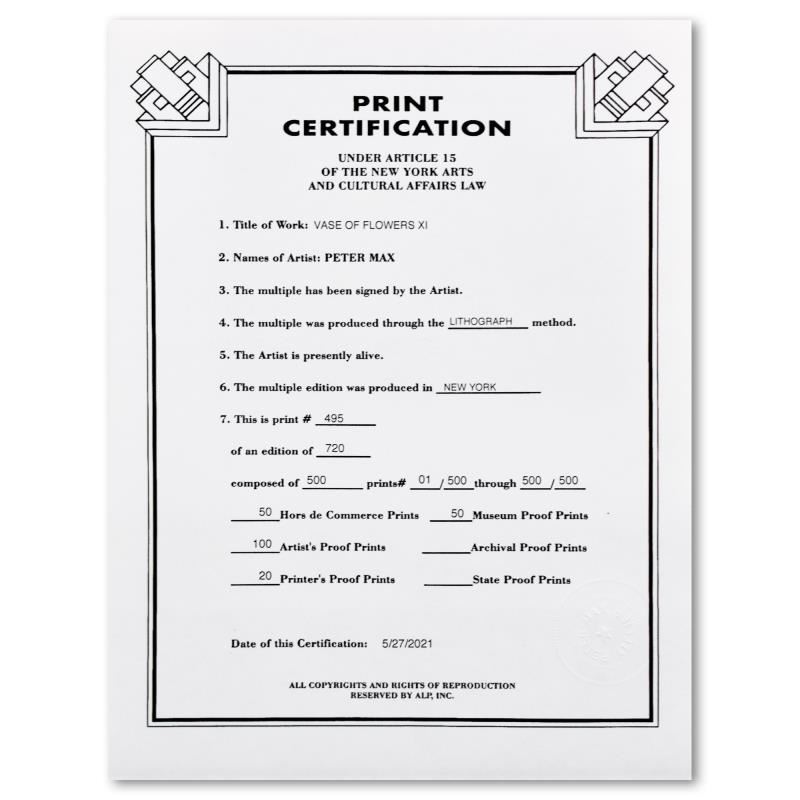 Vase of Flowers XI by Peter Max. Please see photos and description for all available information. "Vase of Flowers XI" is a limited edition lithograph on paper by Peter Max, numbered 495/500 and hand signed by the artist. This piece comes framed. Includes Certificate of Authenticity from Peter Max Studios. Measures approximately 21" x 23" (frame), 9" x 11" (image).