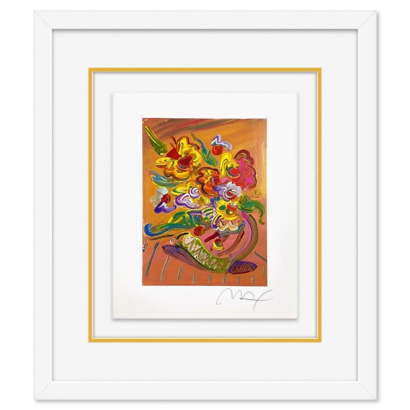 "Vase of Flowers XI" is a limited edition lithograph on paper by Peter Max numbered and hand signed by the artist. This piece comes framed. Includes Certificate of Authenticity from Peter Max Studios. Measures approx. 21" x 19" (frame) 11" x 9" (image).