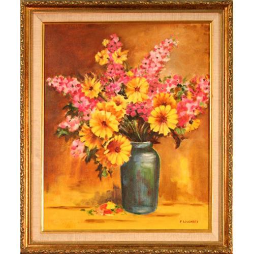 This wonderfully original oil painting, entitled ?Vase of Springtime,? was done by the extremely imaginative F. Loughrey. It is a beautiful still life of a very dynamic floral arrangement. The vividness presented by the colors is definitely eye catching with its bright pinks and yellows. The dusty blue colored vase adds a nice contrast while also reflecting some of the green hues found in the arrangement. Even though the actual vase of flowers would be considered to be a very static piece, the way it is represented in the painting is anything but, it is full of energy and life as it pulses with the warmth of its very existence. Painted in a somewhat impressionistic style, the brushstrokes are quick and flow throughout this stunning work of art, all while capturing the moments of light that make this painting so exquisite. While utilizing the same golden hues found in the floral blooms, the background subtly changes into deep hues of ochre and sienna, making for a rich backdrop for the still life. The background also recedes in comparison to the bold and lively flowers that lean this way and that to greet the viewer. This extraordinary piece is framed in a gorgeously ornate gold wood frame with a cream liner that is also trimmed in gold, making the entire piece measures 20? x 24?. In addition, Loughrey has signed the painting in the lower right hand corner. This painting is truly charming and will definitely brighten up any space, not to mention what an excellent buy it is.