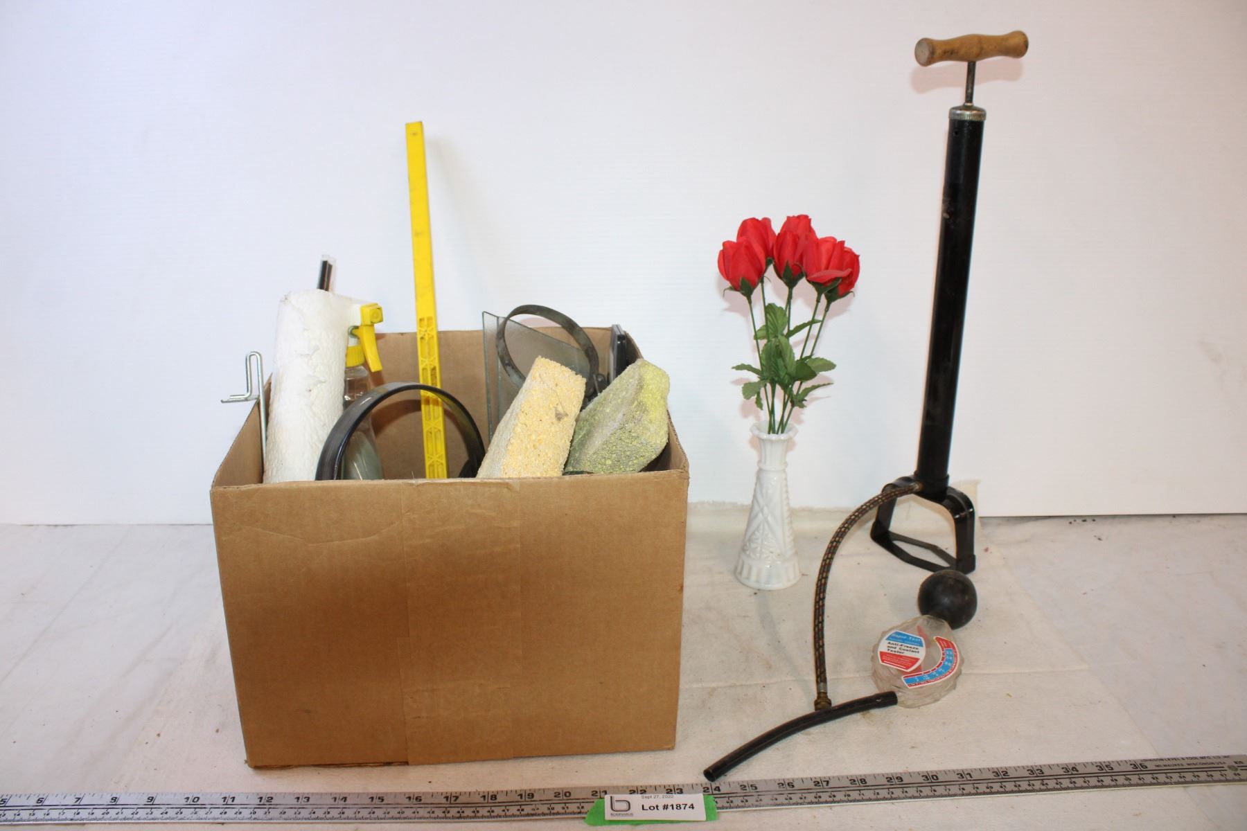 Vase w/ Fake Roses, Bike Pump, Coolant Tester + Box of Misc