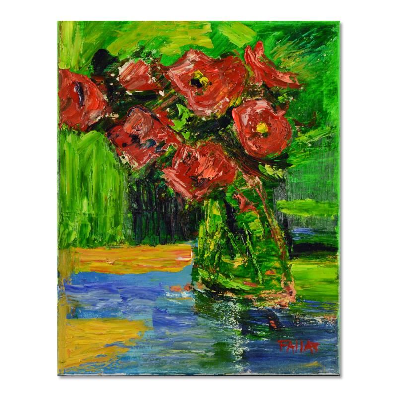 Vase with Poppies is an original oil painting on canvas by Elliot Fallas, hand signed by the artist. This piece comes gallery wrapped. Includes Letter of Authenticity. Measures approx. 16" x 20" (image).