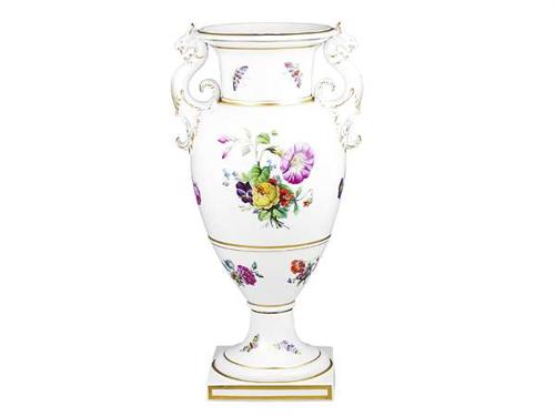 Porcelain, colour painting and gilt. Angular shape base, vase with bunches of flowers and butterflies on the surface. Dragon handles. Restored. Marked: under glaze blue and red stamped, KPSIZE Royal Porcelain Manufacture, Berlin, Second half 19