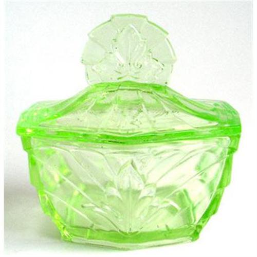 This beautiful Art Deco pale green Vaseline Depression glass powder jar has a circular pinwheel designed finial with a leaf in its center as well as the front and back of the six sided jar. It fluoresces brilliantly under black light, stands 4" tall x 4" long x 2 3/4" deep with both the lid and jar in excellent condition. There is a smaller matching dresser jar and a matching pair of candlesticks for sale in separate auctions.