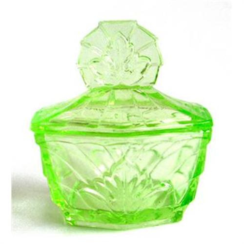 This beautiful Art Deco pale green Vaseline Depression glass powder jar has a circular pinwheel designed finial with a leaf in its center as well as the front and back of the six sided jar. It fluoresces brilliantly under black light, stands 3 1/2" tall x 3 1/2" long x 2 1/2" deep with both the lid and jar in excellent condition. There is a larger matching dresser jar and a matching pair of candlesticks for sale in separate auctions.
