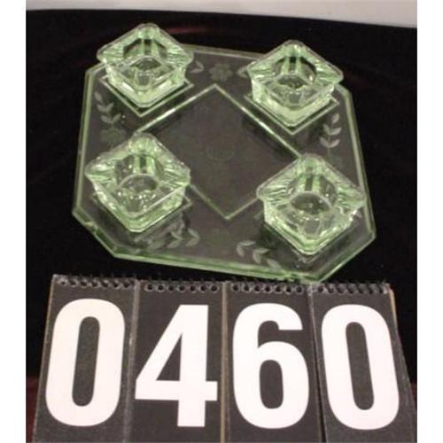 Vaseline glass candle set and tray, or they may also be ashtrays? It has a few small nicks but a very nice example of vaseline glass for any collection. Tray has a floral design, approx 7-1/2" x 7-1/2" x 2", 2 lbs..[278]