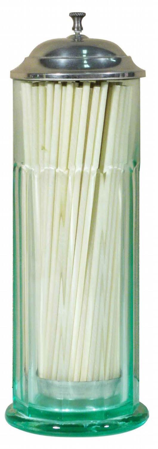Vaseline Glass Straw Holder, elevator lid. No chips or cracks. 11 1/4 inches tall.