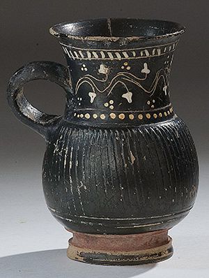 Vases. Apulian black-glaze Gnathian ware mug. Circa late 4th century BC. D/ The ovoid body with moulded ribs, decorated with garland of ivy in added white and yellow dots around the neck, single handle, with a ring foot reserved on the base. 12 cm high. Intact.
