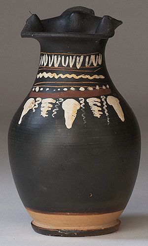 Vases. Apulian black-glaze Gnathian ware oinochoe. Circa late 4th century BC. D/ The body with painted grapevine and tendril pattern in white, yellow and red, with a ring foot reserved on the base. Trefoil shaped mouth. 15 cm high. Intact