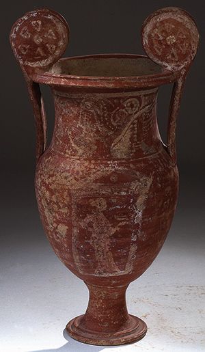 Vases. Apulian painted volute-krater. Circa 4th century BC. D/ A volute krater with an ovoid body tapering to a flared foot. The handles ending in a volute to the top of the rim. The obverse with a female figure standing right in naiskos; the neck with a female head to left; the volutes with rosettes. The reverse with a female head; the neck with a laurel branch; the volutes with a circles of dots. 28.5 cm high. Repaired with slight restoration.