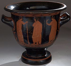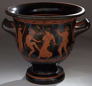 Vases. Apulian red-figure bell-krater. Circ a4th century BC. D/ The obverse with Dionysiac thiasos. Two maenads, one with thyrsus, the other with torch and two satyr, one dancing, the other playing diaulos. Above the characters, inscription in white: ????, ?????, ?????, ??????O?. The reverse with three youth dressed with himatia, one of them holding strigil, another with staff. Band of meander and chequerboard squares below the scenes, laurel wreath below the rim. 31.5 cm high. Repaired.
