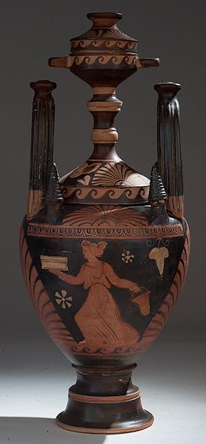Vases. Apulian red-figure lebes gamikos. Circa 4th century BC. D/ The obverse with female figure advancing left, holding cista and situla. Around two rosettes and wine leaf in added white. The reverse with female figure seating right holding phiale, before, rosette and a flowering plant in added white. Band of waves below the scenes, ovolo frieze above the scenes. Four conical finials on shoulders. Inverted U-shaped handles with disk knob finials at the center. The superior part and the lid with palmettes and bands of wave. 48.5 cm high. Intact.