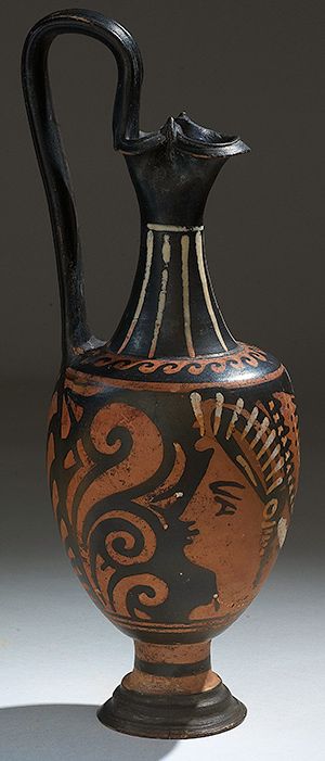 Vases. Apulian red-figure oinochoe. Circa 4th century BC.  D/ The body with a female head in profile to the left, wearing radiate stephane and sakkos, earrings and beaded necklace, band of waves on the shoulders, rays on the neck, a large palmette complex below the handle, details in added white and yellow. Two reserved bands on foot. Trefoil shaped mouth. 27.5 cm high.        Minor damage on body. Repaired foot.