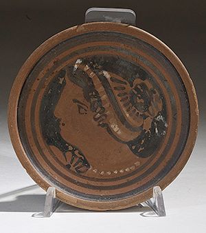 Vases. Apulian red-figure plate. Circa 4th century BC. D/ With a female head in profile to the left, wearing radiate stephane and sakkos, within alternate bands of red and black, details in added yellow and white. 13 cm diameter. Intact.