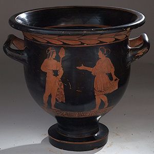 Vases. Attic red-figure bell-krater. Circa 4th century BC. D/ The obverse with Dionysos standing right, holding thyrsos and kantharos and a female figure (Ariadne?) standing left, holding situla. The reverse with two youths dressed with himatia. Frieze of meander and crossed square below the scenes, laurel wreath below the rim. 30.5 cm high. Repaired.