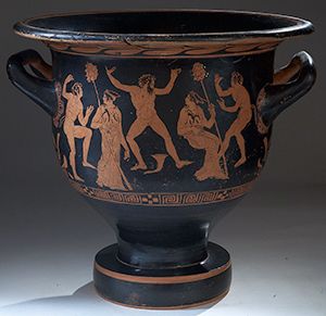 Vases. Attic red-figure bell-krater. Circa 4th century BC. D/ The obverse with three dancing satyrs and two maenads with tyrsus topped with ivy. The reverse with three youth dressed with himatia, one of them holding strigil. Band of meander and chequerboard squares below the scenes, laurel wreath below the rim. 40 cm high. Repaired.