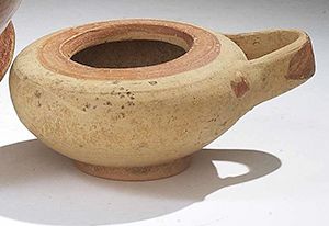Vases. Daunian terracotta kothon. Circa 4th century BC. D/ Decorated in red. 12 cm length.