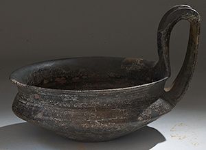 Vases. Etruscan bucchero-ware kyathos. Circa 7th century BC. D/ Biconical body, with high-arching strap handle. 17.5 cm high. Repaired.
