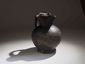 Vases. Etruscan bucchero-ware oinochoe. Circa 6th century BC. D/ With a flaring foot, one handle, globular body, short neck, everted rim pinched into a trefoil shaped mouth. 23 cm high. Repaired. Foot reattached.