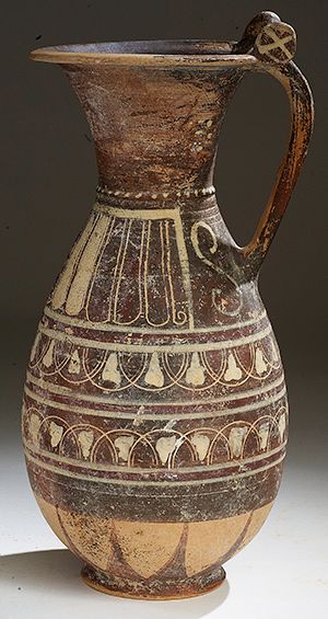 Vases. Etrusco-Corinthian polychrome olpe. Circa early 6th century BC. D/ The body with two bands of overlapping scale pattern, horizontal bands of red and white between, crosses on the rotelles, rays on foot. 29 cm high.