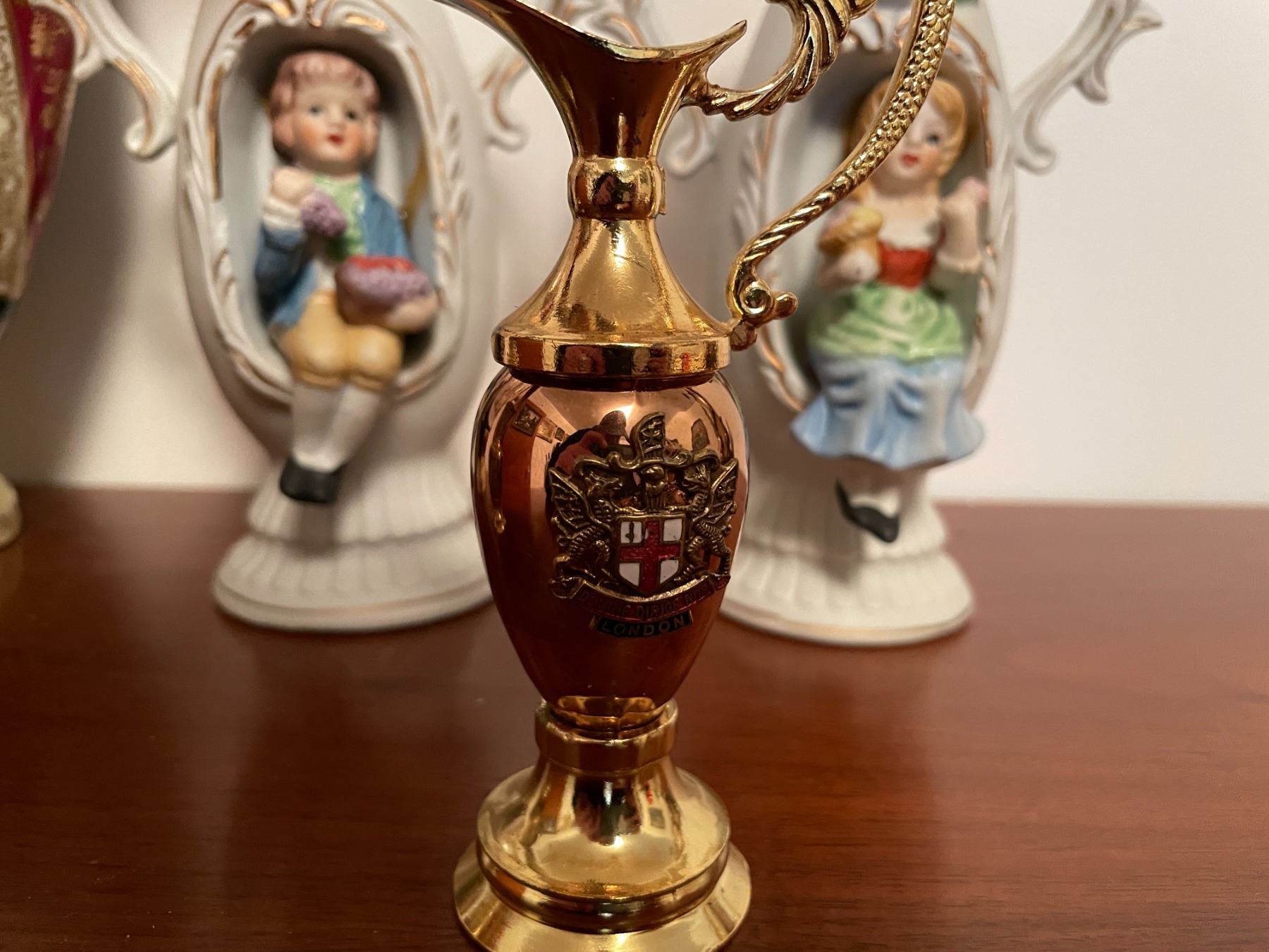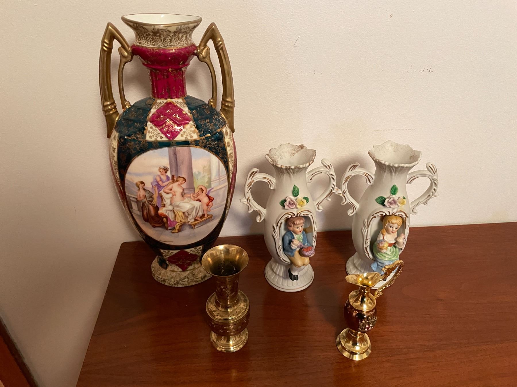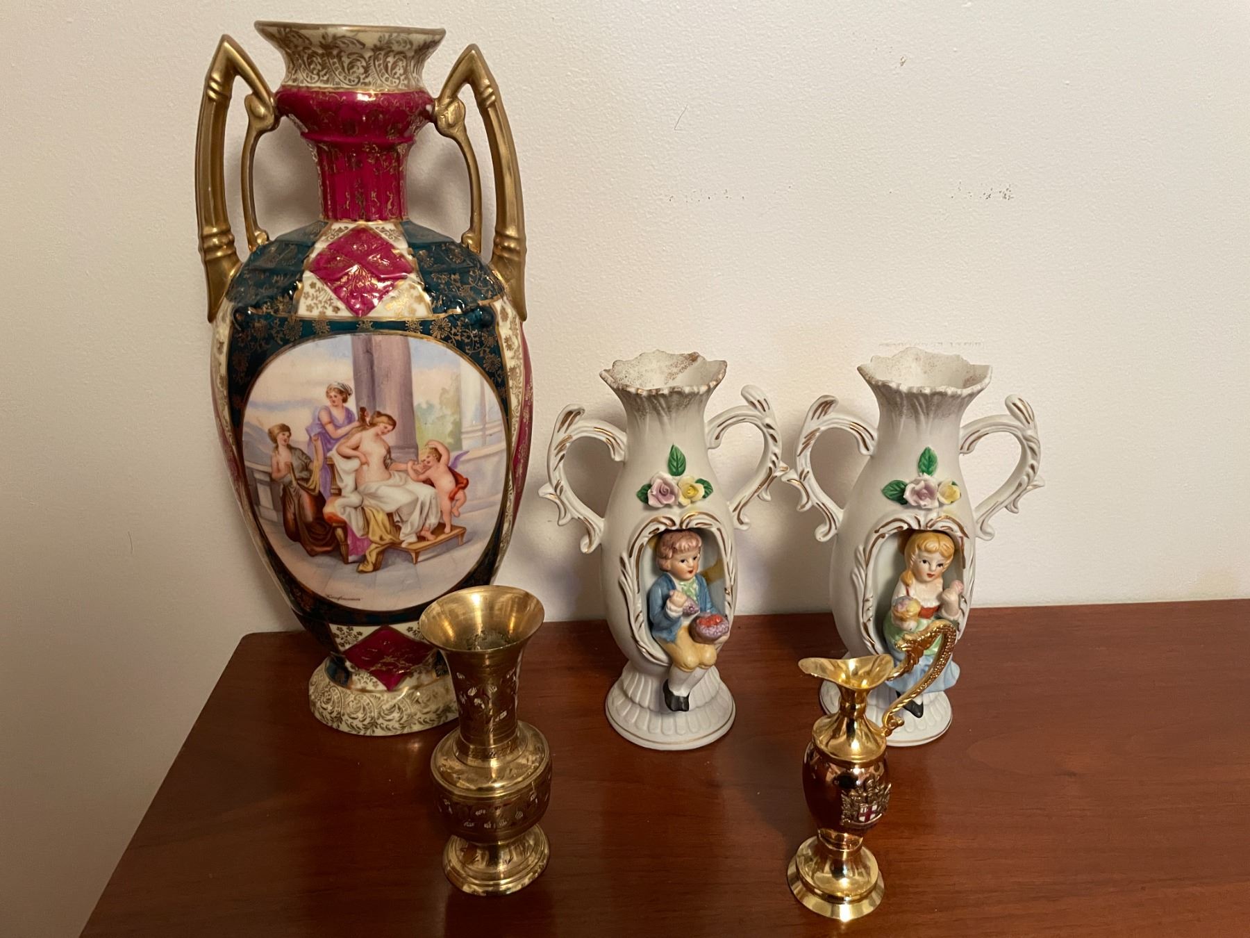 6 vases - tall vase marked Austria - small metal marked Made in England