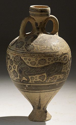 Vases. Middle Corinthian pottery amphoriskos. Circa early 6th century BC. D/ The piriform body with frieze of a panther and a grazing ibex, another panther and a bird in frieze on shoulder above, rosettes in the field in both registers, a zigzag at neck and rays around the foot. 17.2 cm high. Repaired. Hole.