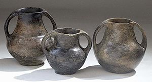 Vases. Three Villanovan impasto amphorae. Circa 8th - 7th century BC. D/ 8.5, 10 and 11 cm high. One with minor damage.