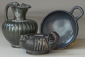 Vases. Three balck-glazed vessels. Circa 4th century BC. D/ Apulian miniature black-glazed oinochoe, with ribbed body. Metallic sheen. 11 cm high. Campanian Black-glazed guttus, with ribbed body and moulded lion head spout and ring handle. 10.5 cm diameter. Black glazed bowl on ring base with single loop handle. 10 cm diameter.