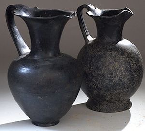 Vases. Two Etruscan bucchero-ware oinochoai. Circa 7th - 6th century BC. D/ 27 cm and 28 cm high. Repaired.