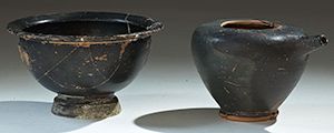 Vases. Two Italic black-glazed vessels. Circa 4th century. D/ Guttus. North-Adriatic. 7.5 cm high. Repaired. Cup with stamped decoration in the centre. 7 cm high. Repaired. Two holes, where missing handle has been attached.
