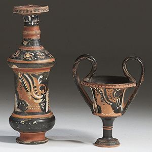 Vases. Two apulian red-figure vessels. Circa 4th century BC.  D/ Miniature kantharos, with female head on both sides, looped strap handles. 10 cm high. Repaired. Alabastron, with female head, rosettes on shoulders. 15 cm high. Repaired.