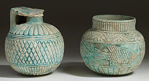 Vases. Two egyptian faience aryballoi. Circa 7th-6th century BC. D/ Turquoise blue in color, both with spherical body; one with a short cylindrical neck and wide strap handle; the other with fish decoration and without handle. 9.5 cm high. Minor damages.