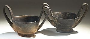 Vases. Two etruscan bucchero-ware kantharoi. Circa 7th - 6th century BC. D/ With looped strap handles. 11 and 11.5 cm high.
