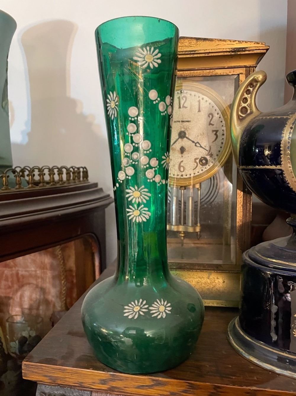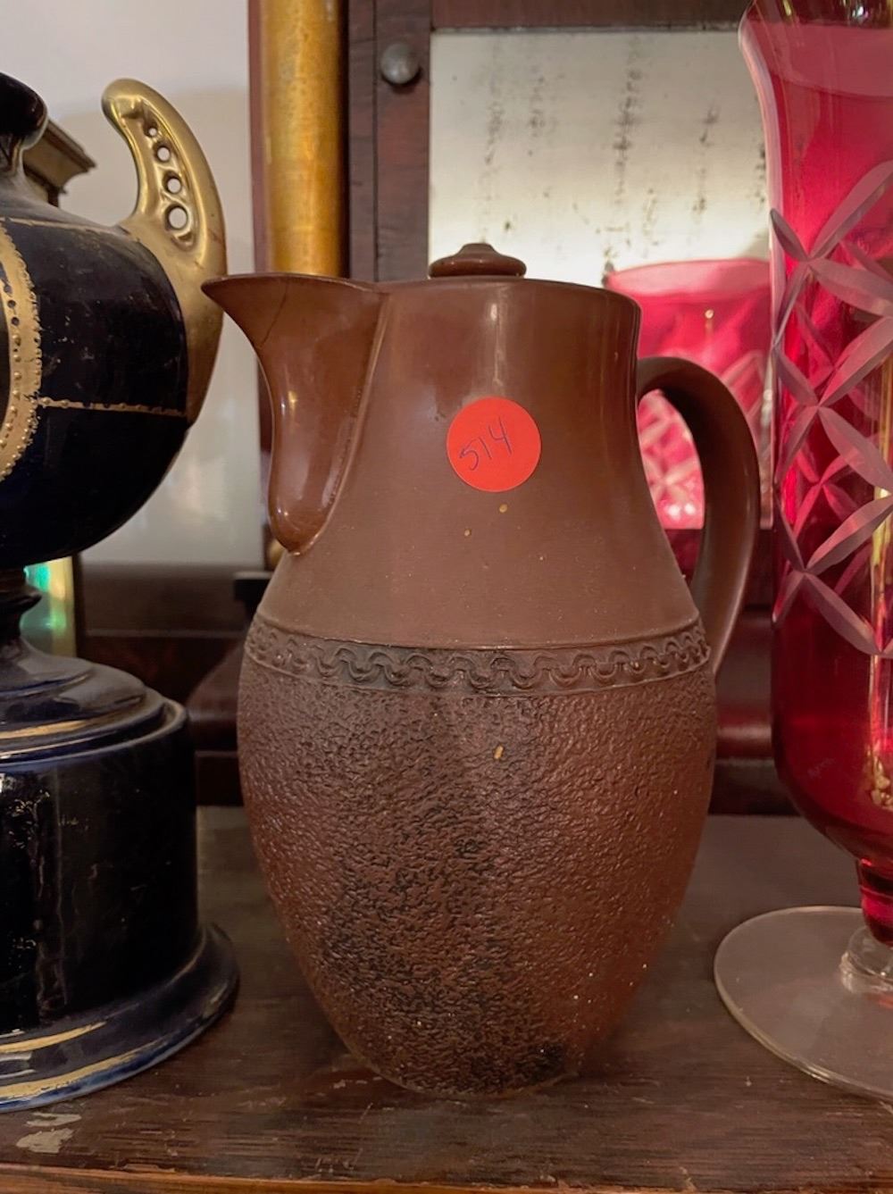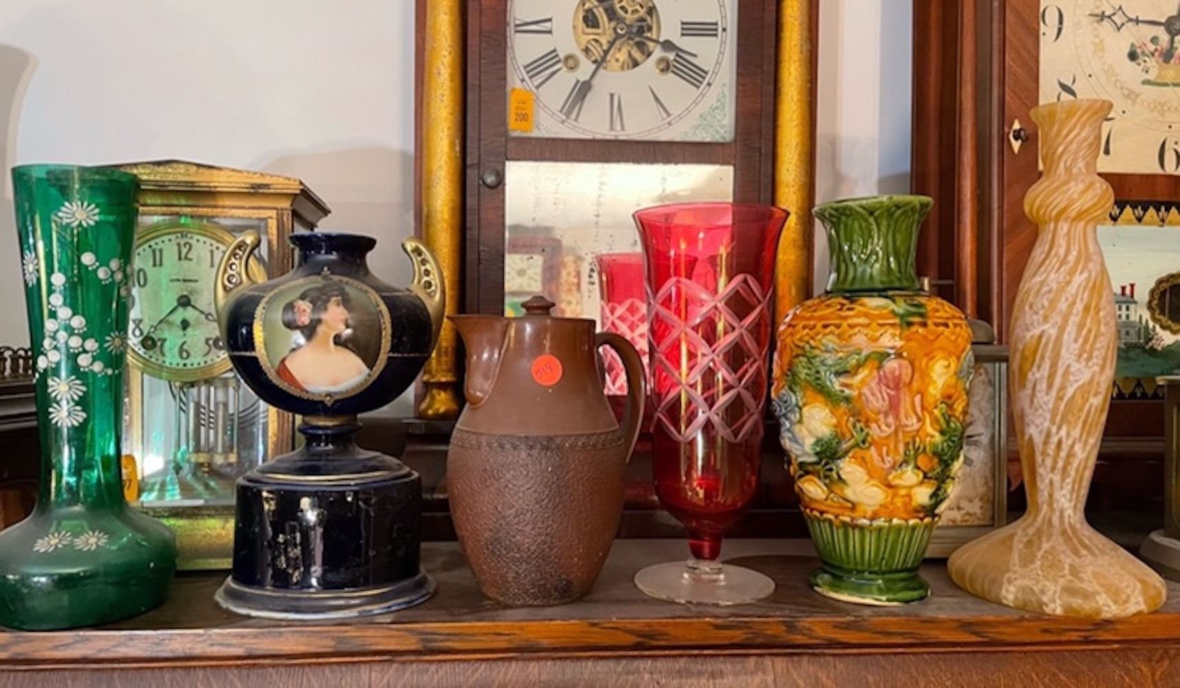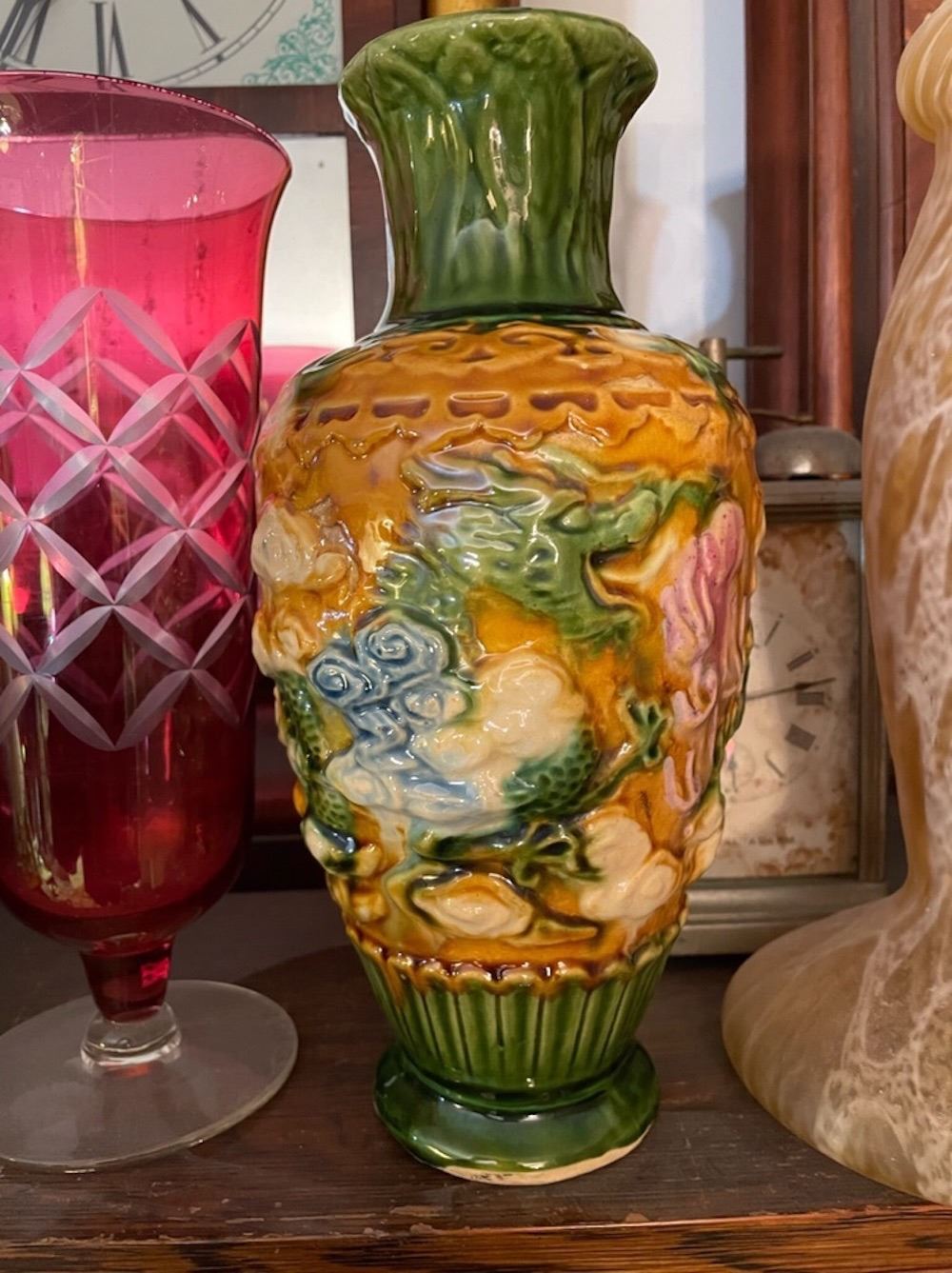 Vases including hand painted green glass, portrait vase, ruby glass, Asian vase with dragons, art glass vase and early redware covered pitcher. 6 pieces, from the lifetime collection