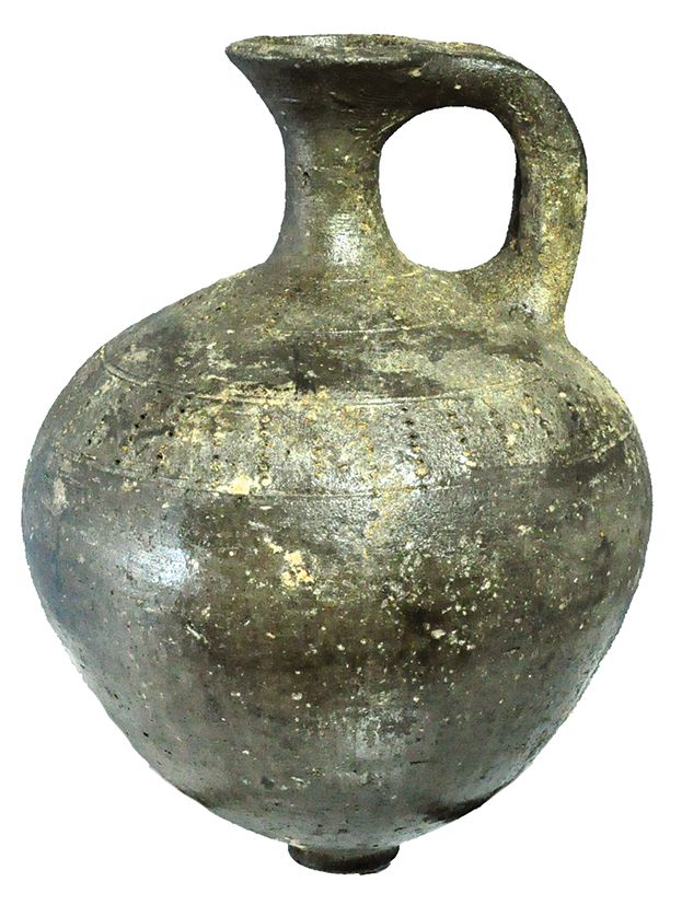 Vasija. Siglos VI-IV a.C. Cerámica. Decorada con adornos incisos en bandas concéntricas. Altura 13,0 cm. Diámetro 9,0 cm. Incluye peana.