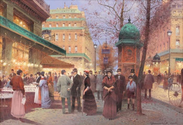 Vasiliy Nicholayevich Gribennikov (b. 1951). Rush Hour. 13 1/2" x 19 1/2" oil on canvas. signed and dated 2009 lower right. Condition Report: Black lights clean.