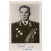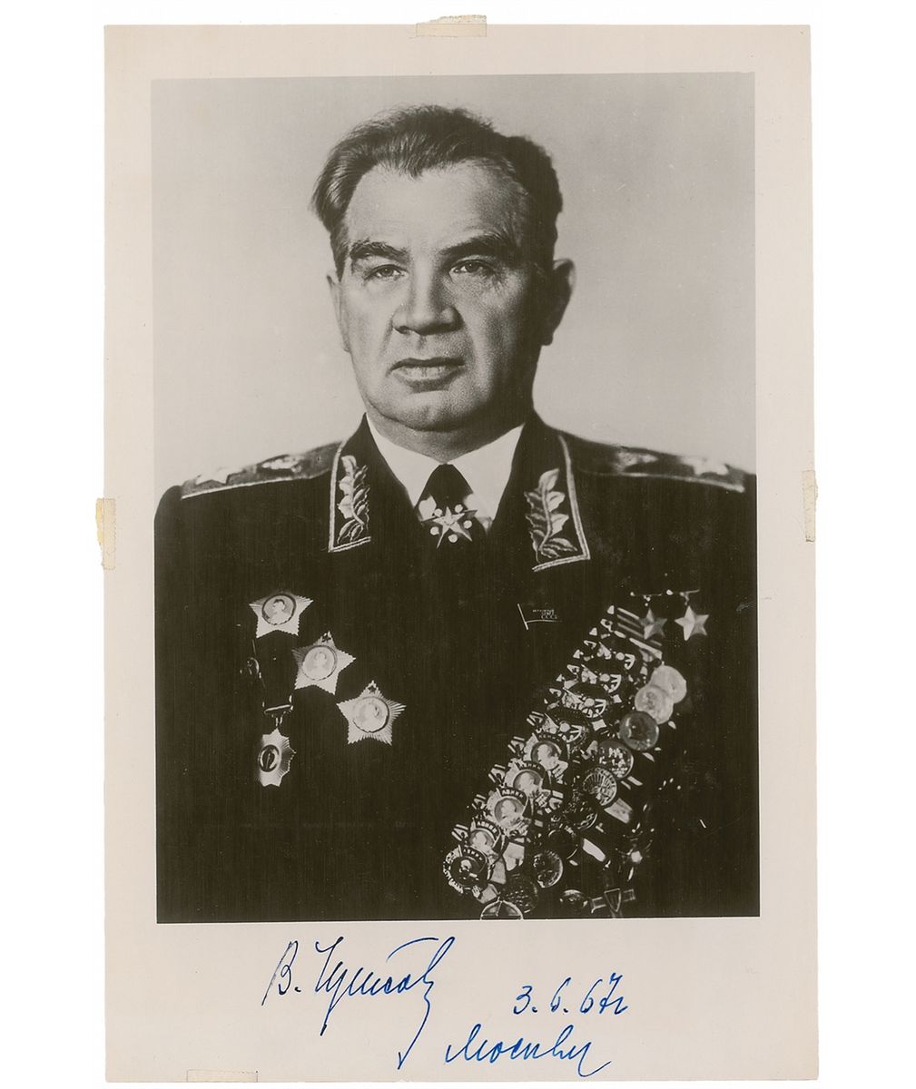 Lieutenant general (1900–1982) in the Soviet Red Army during World War II known for commanding the 62nd Army during the Battle of Stalingrad. Uncommon glossy 7.5 x 11.25 photo of Chuikov showing off an array of medals, signed in the lower border in fountain pen, and dated June 3, 1967. Mild spotting to finish, light creases, a tiny tear to the right edge, and thin tape remnants to edges, otherwise fine condition. Accompanied by the address panel clipped from the original mailing envelope.