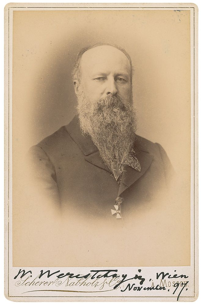 Famous Russian battle painter (1842–1904) who was one of the first Russian artists to be widely recognized abroad. Original 4.25 x 6.5 cabinet photo by Scherer & Nabholz of Moscow, signed with a transliteration in the lower border in black ink, “W. Werestchayin, Wien, November, 97.” In fine condition.