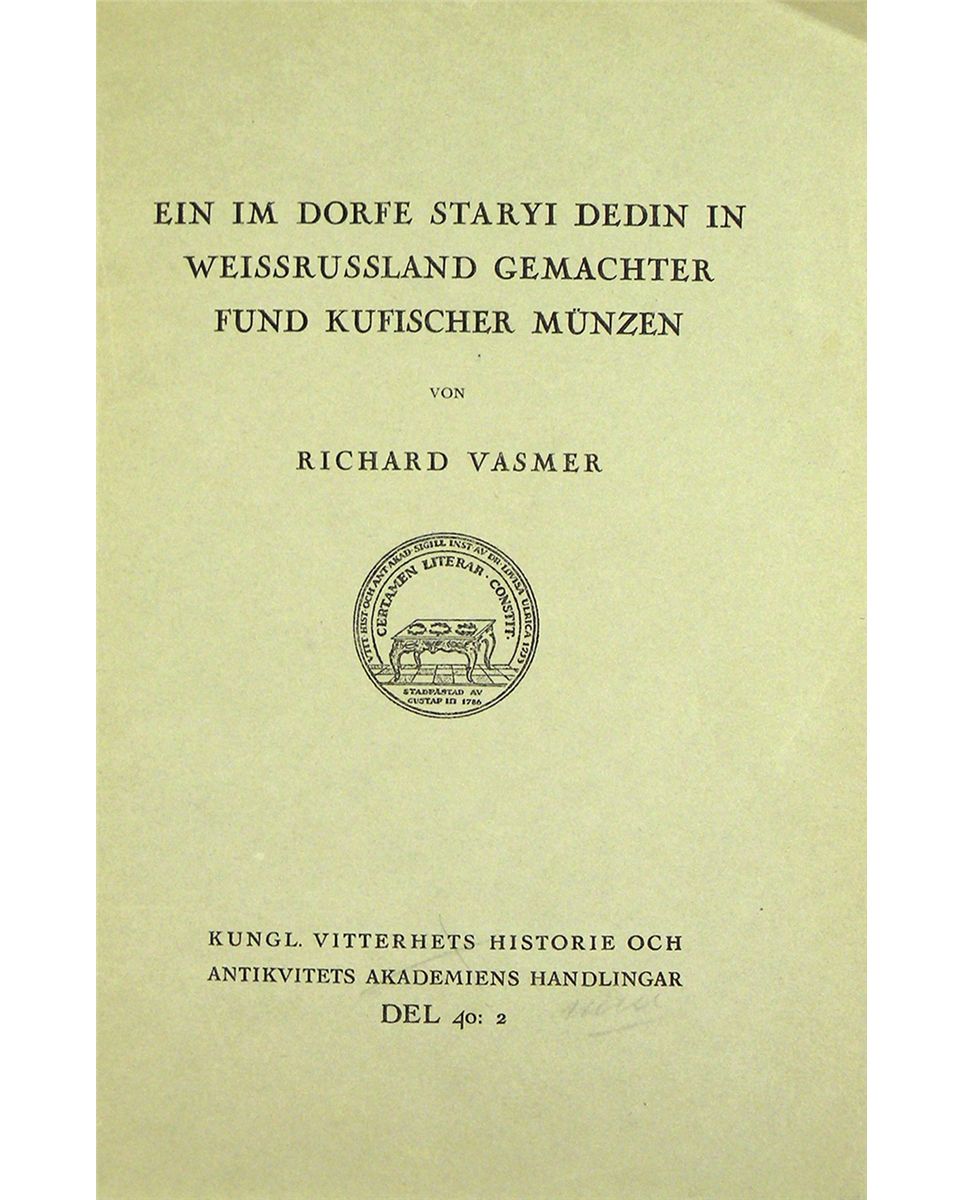 Vasmer, R. EIN IM DORFE STARYI DEDIN IN WEISSRUSSLAND GEMACHTER FUND KUFISCHER MÜNZEN. Stockholm, 1929. 8vo, original printed card covers. (2), 45, (1) pages. Unopened. Near fine. A notable work, reviewed by Zambaur in the Numismatische Zeitschrift. Mayer 1906.