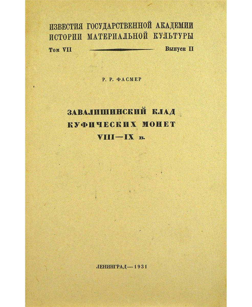 Vasmer, R.R. ЗАВАЛИШИНСКИЙ КЛАД КУФИЧЕСКИХ МОНЕТ VIII–IX В. Leningrad, 1931. 8vo, original printed card covers. (4), 20 pages. Near fine. Rare. One of the last works Vasmer was able to publish in Russia. Mayer 1912: "Umayyads, Abbasids, Idrisids, governors of Tabaristan, geographical list of finds."