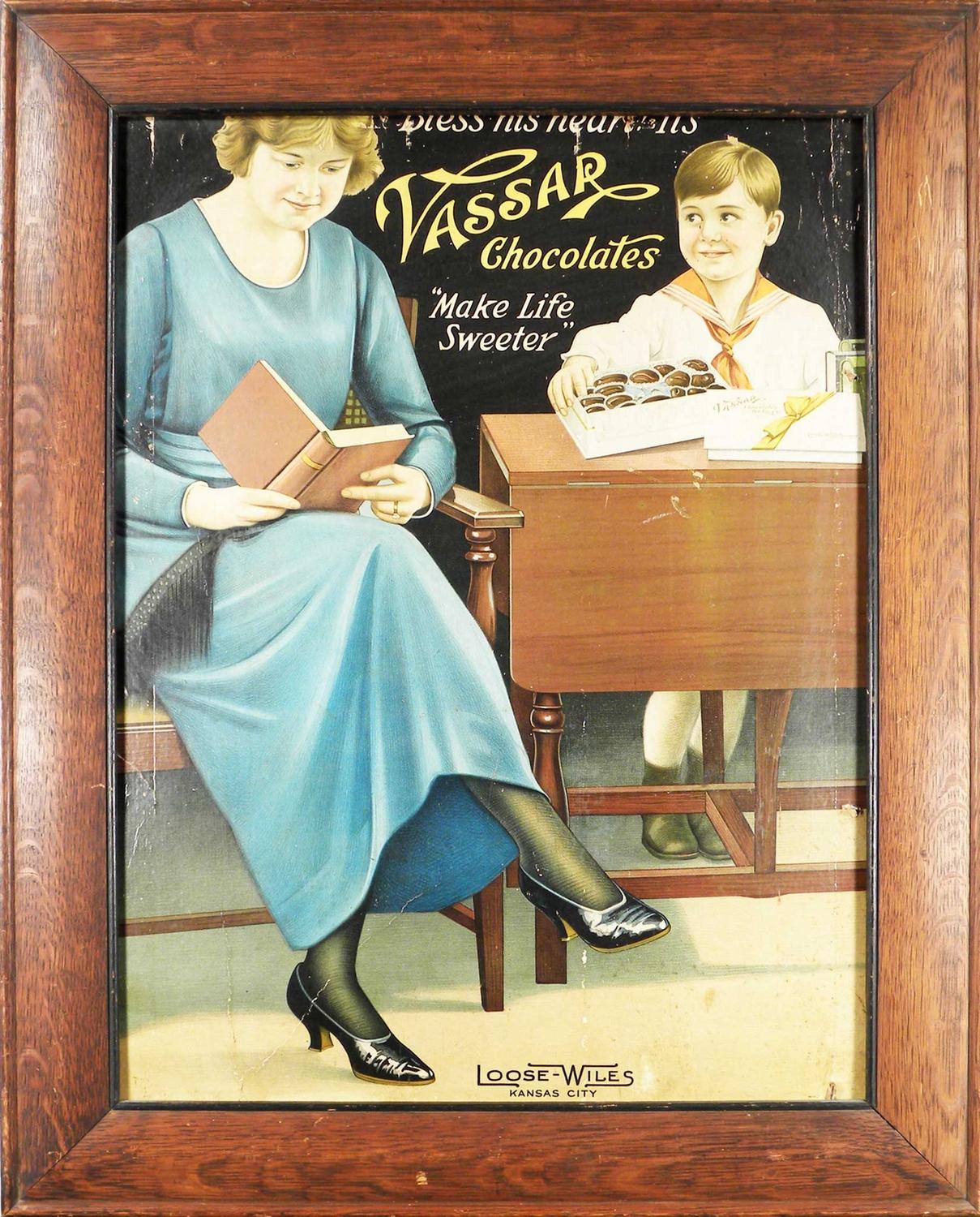 Vassar Chocolates Paper sign depicting a school house scene with teacher and student. Excellent Condition. In Perios Oak Frame