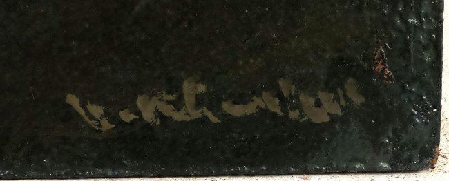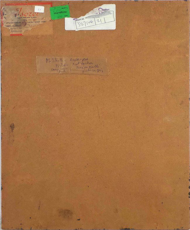 Unframed oil on board depicting a woman in a cloak. Signed lower right, "V. Khmeluk". [Art: 18 1/8" x 15"]. Bears labels from PB84 Sale 767, Lot 1153/2. Minor frame rubbing. Good condition. Craquelure, soiling at edges, minor frame rubbing.